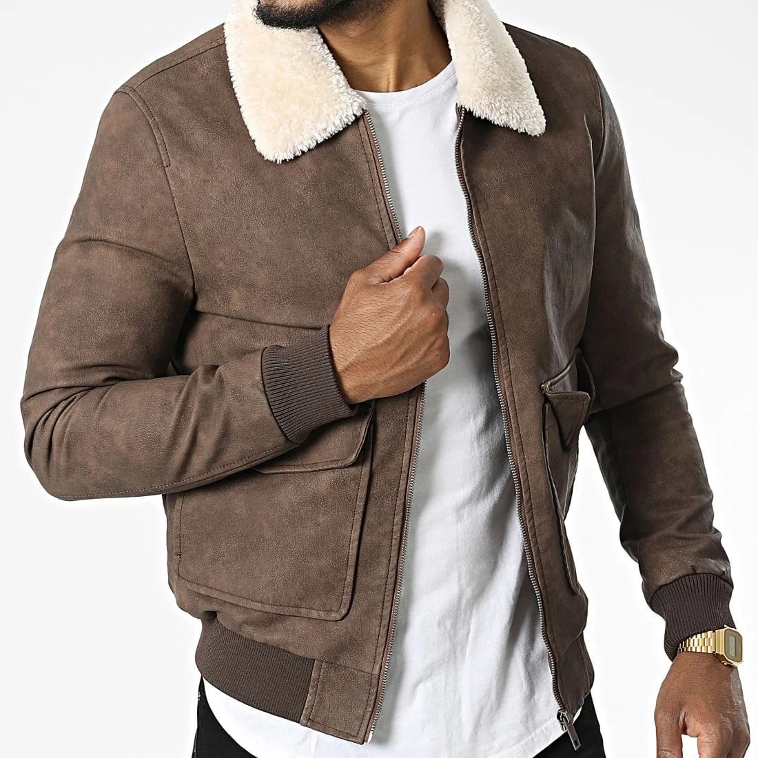 • Veste zippée aspect cuir retourné avec col sherpa